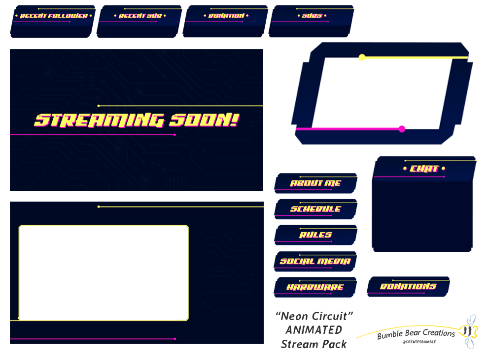 We took our simple neon-colored design and animated the Streaming Soon and main Overlay screens. Customized for Twitch, they also work for YouTube and other streaming platforms. Great for a sleek tech look.